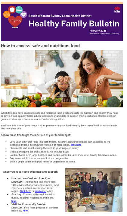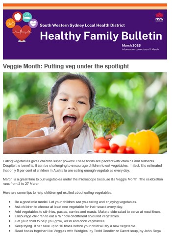 The Health Promotion Service, from South Western Sydney Local Health District, produces the Healthy Family Bulletin for everyone in the community. Families, community groups, educators and teachers can read the latest news and information about healthy eating, staying active and living well.