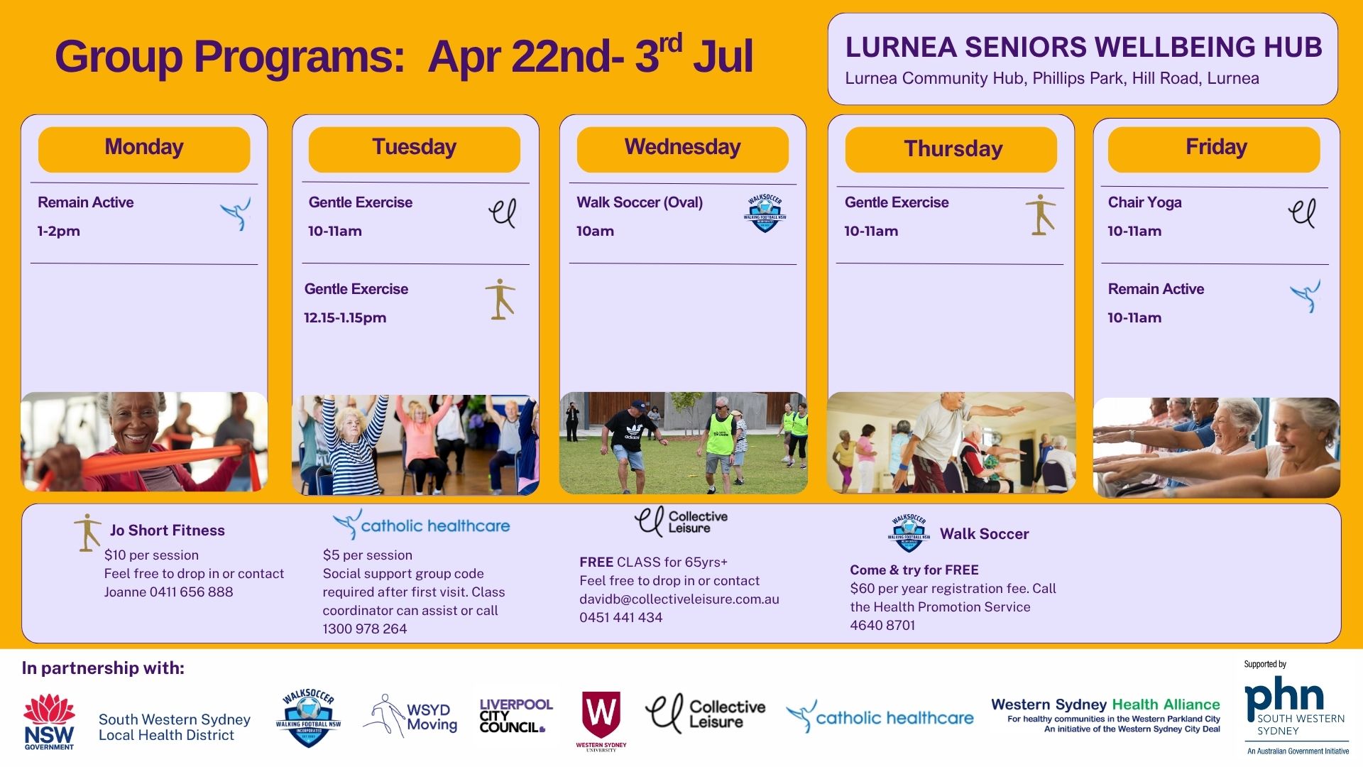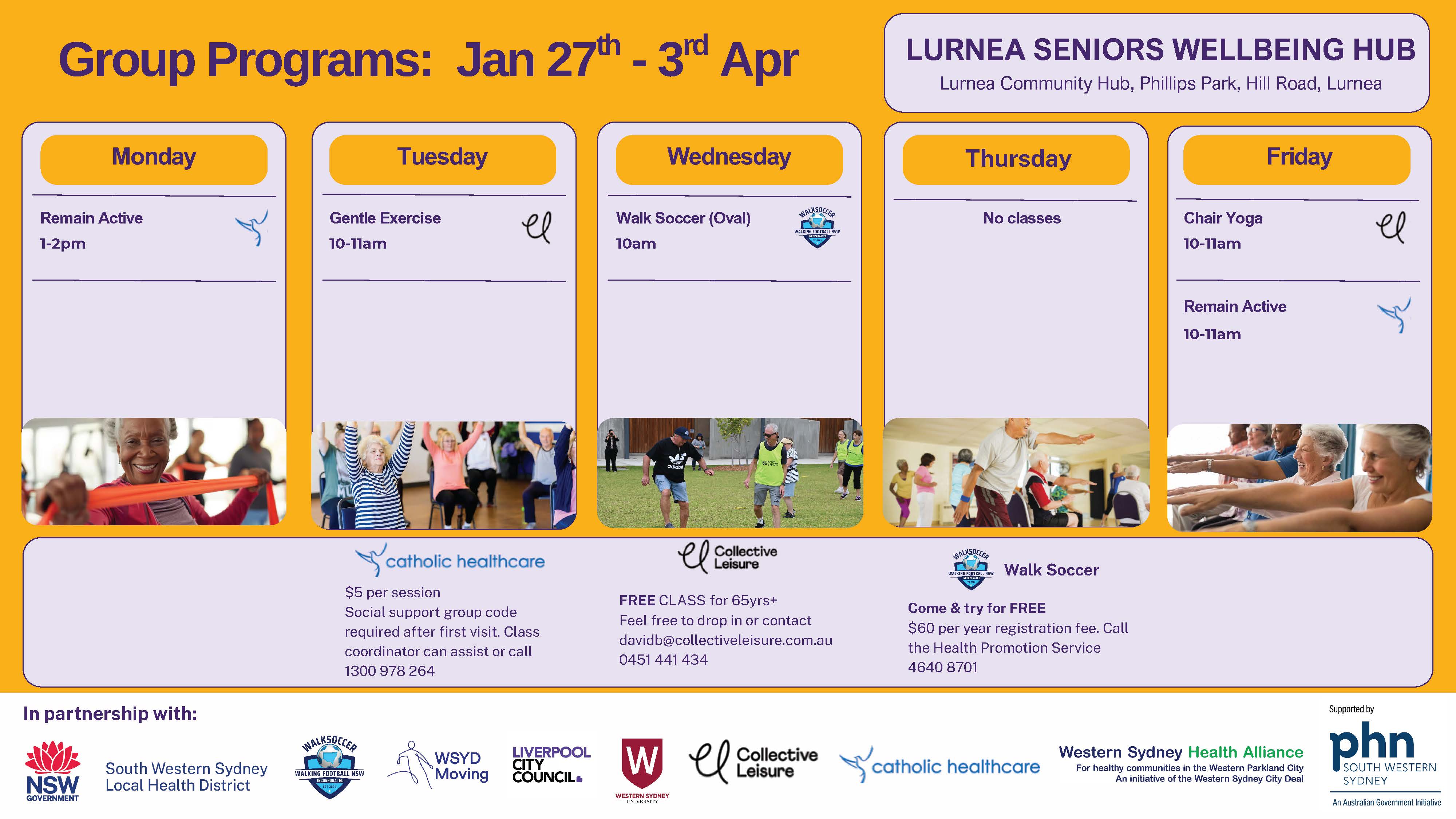 Lurnea Seniors Wellbeing Hub Breadcrumb Home - Healthy Ageing - Move More Lurnea Seniors Wellbeing Hub Lurnea Seniors Wellbeing Hub Free and low-cost programs to improve well-being, get active and meet new people. Activities include: Gentle exercise and chair yoga Tai Chi sessions Please note that programs may change from Term to Term. Classes are available during school terms only. Please see timetable below Who can join: 65 years old and over (50+ for Aboriginal or Torres Strait Islander people) How to join: Location: Liverpool (Lurnea) 66 Hill Rd, Lurnea NSW 2170 Contact: 0410 144 372 Register here Timetable Related Topics Supplementing your Diet The are some nutrients that are recommended to supplement during pregnancy... Read More